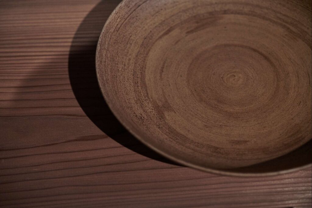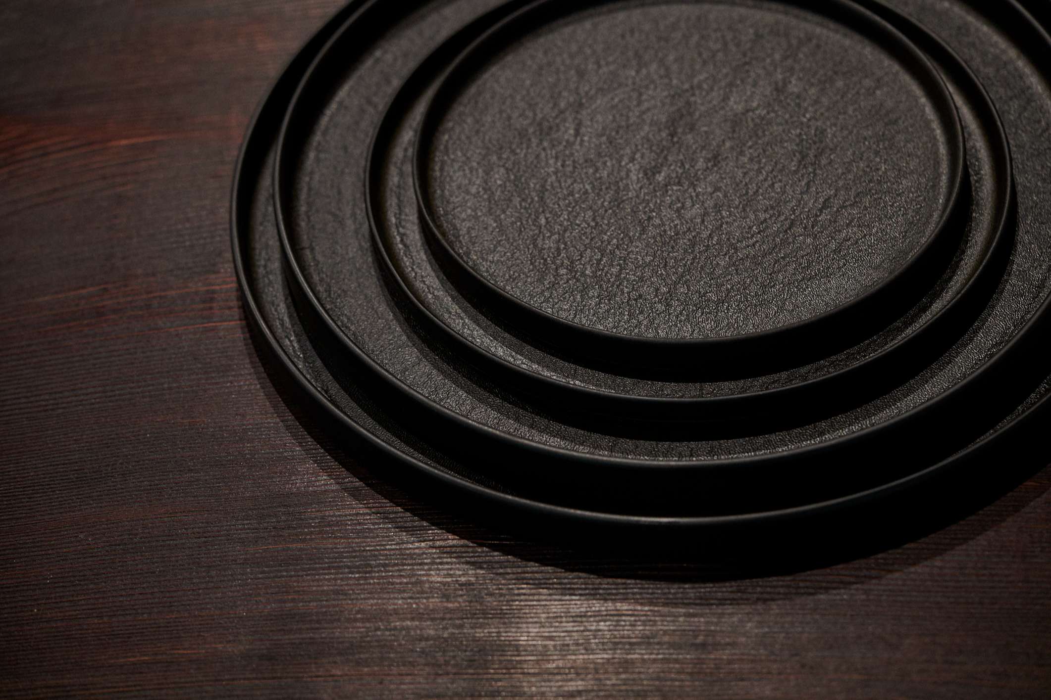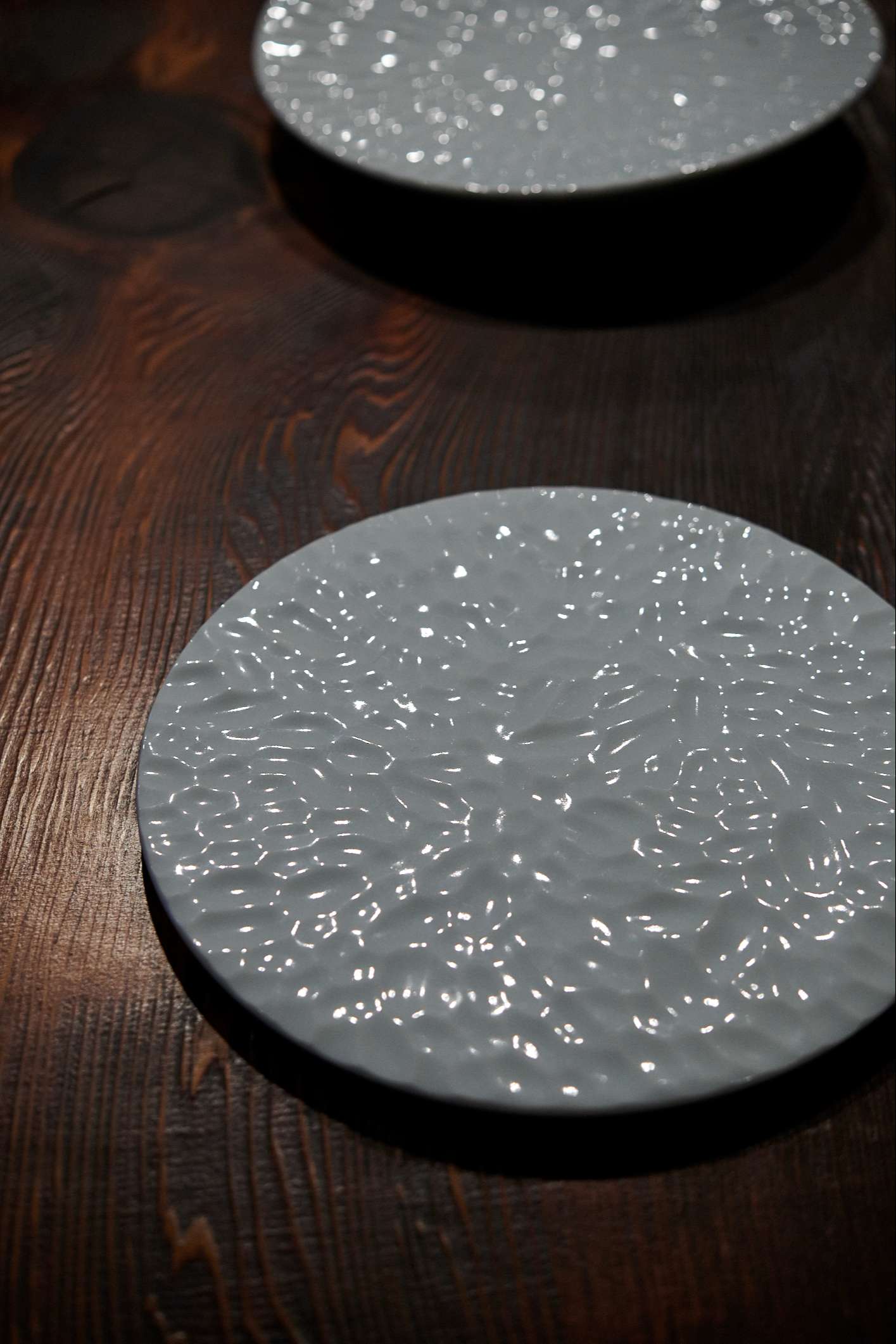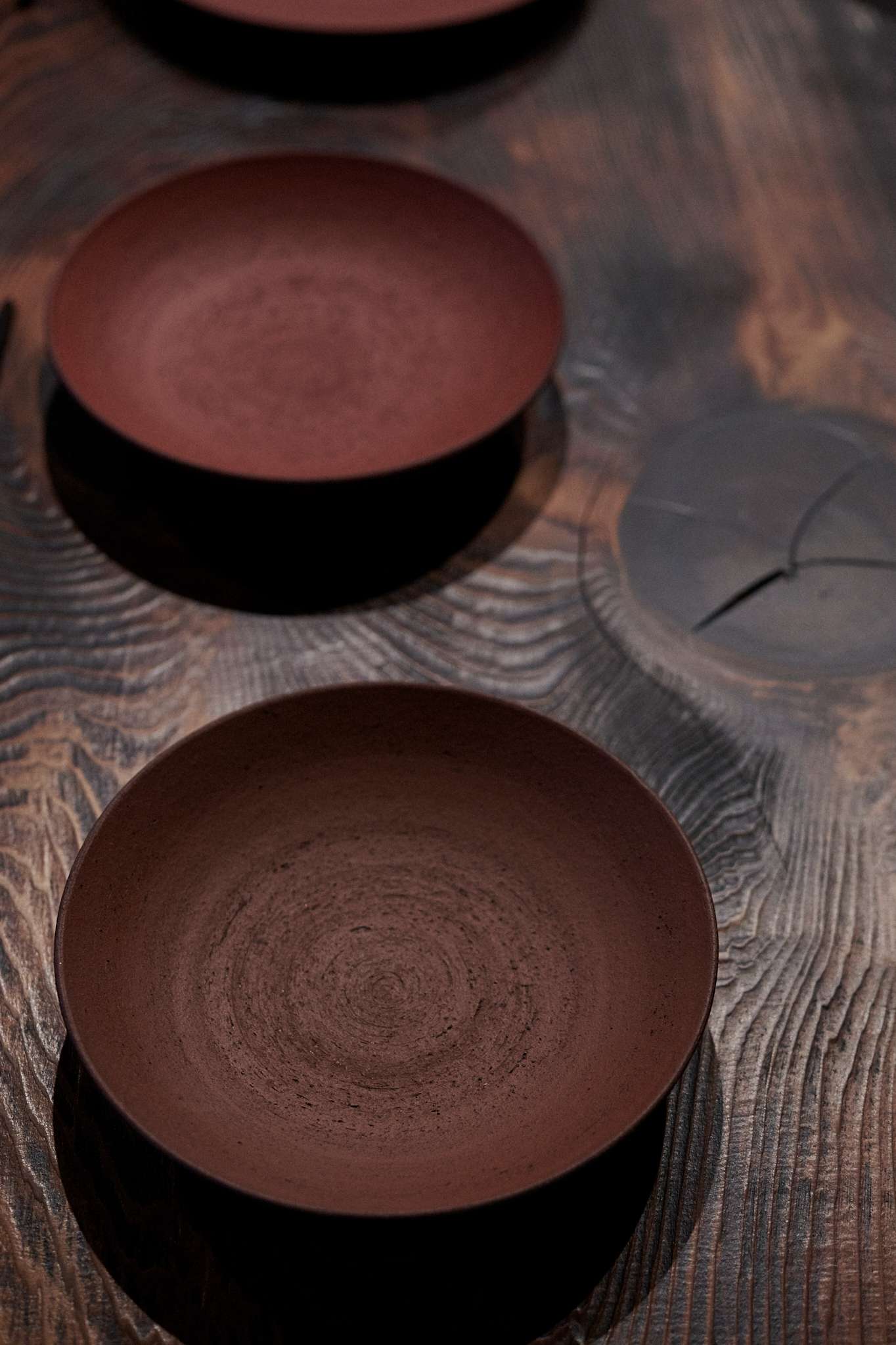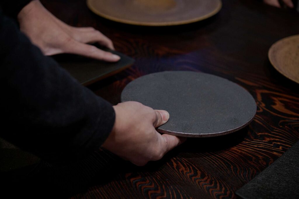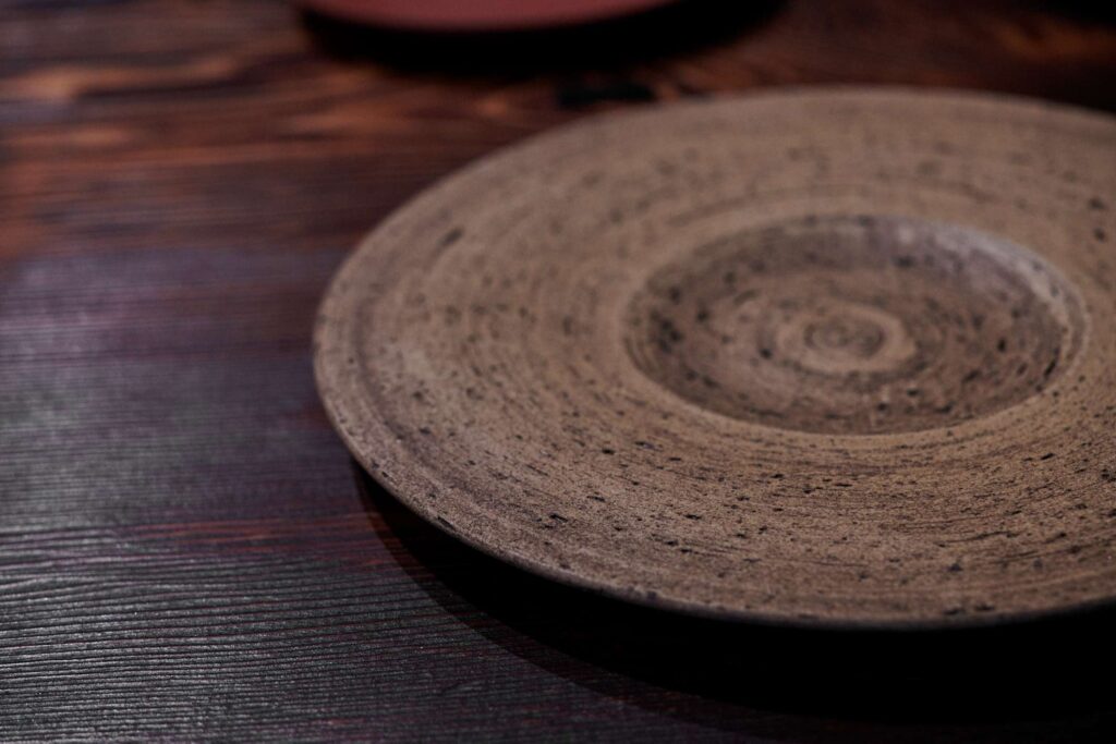 完成させない。お料理をのせる必要があるので、僕がやり切ると、お料理がのってお客様の前に出たときに、ちょっと疲れる一皿になってしまう気がします。だから僕は一歩引いて、もの足りないぐらいで止める必要があると思っています。やりきらないことが大切です。そして、器に関しては、僕は基本的には丸でいいと思ってるので、丸ばかり作っています。昔は、模様や装飾など何かしないと不安という気持ちもあって、いろいろな形を作りましたが、僕も料理をするので、結局丸が一番使いやすくしっくりくるという結論に至りました。作り込むのは、彫刻でガンガンやればいい話なので。