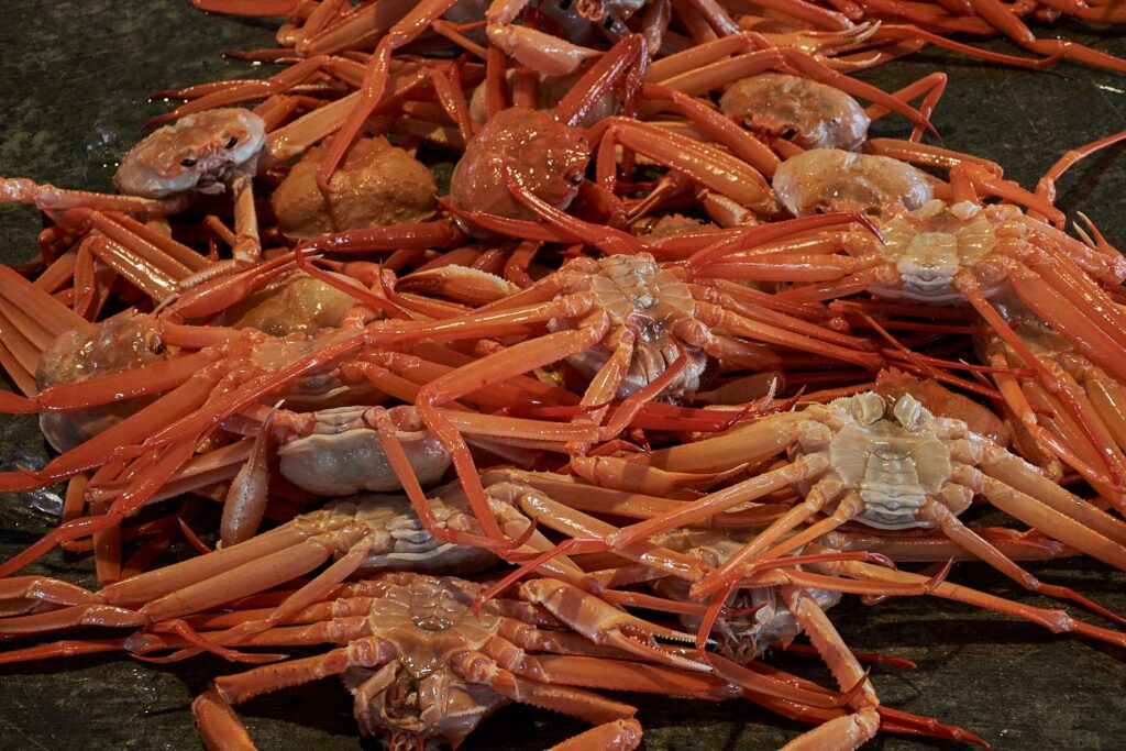 より深い水深 800m~1,200mで獲れる紅ズワイガニは、生でも赤く、身がみずみずしく甘いのが特徴で、漁獲量も多く、1日平均4,000匹ほど、獲れる期間も長い。