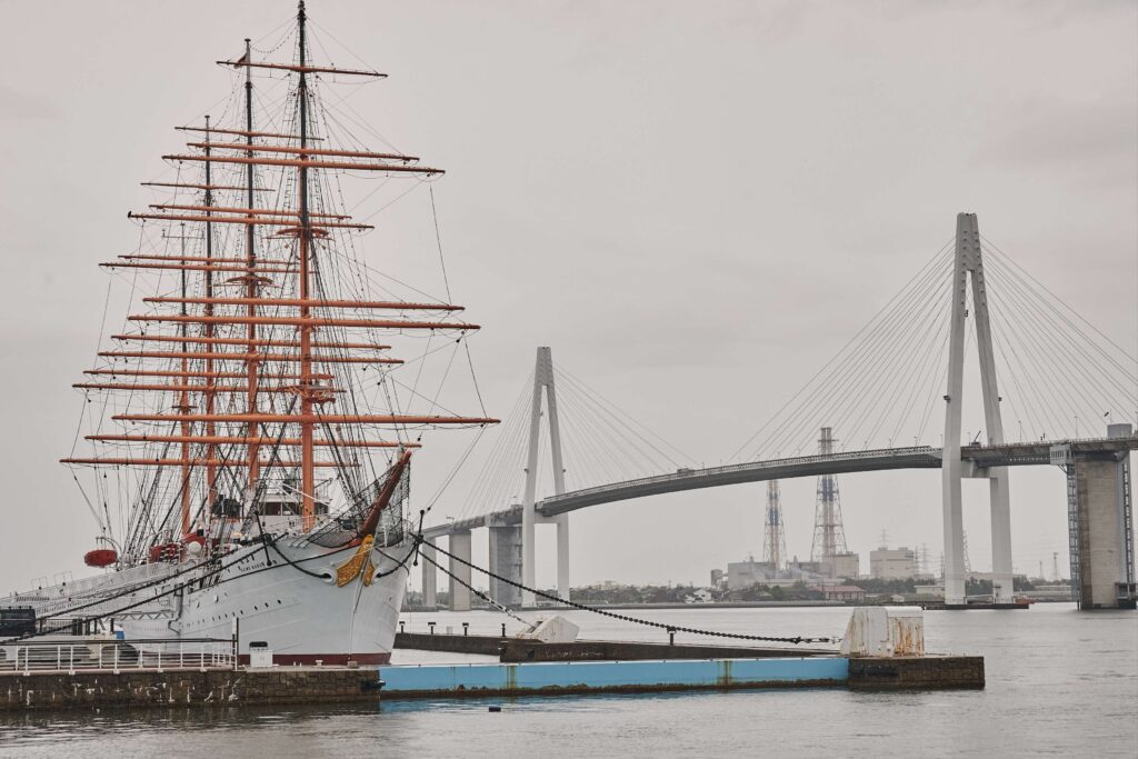 射水の名所の一つ、新湊大橋を臨む海王丸パーク。晴れた日は橋の向こうに壮大な立山連峰が見える絶景スポット